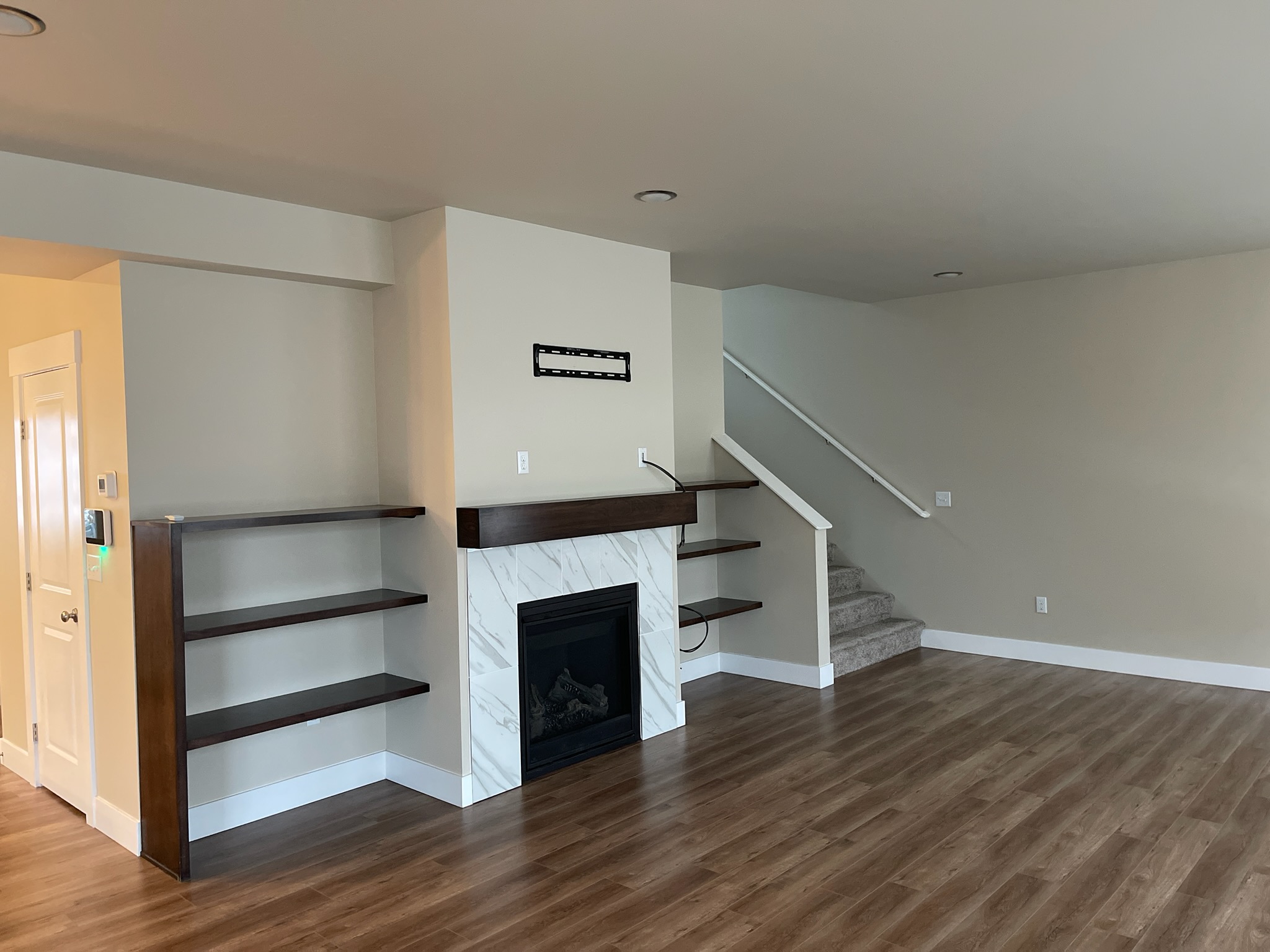 Cozy living room with laminate flooring throughout the unit, wood burning fireplace and in downtown Wasilla.